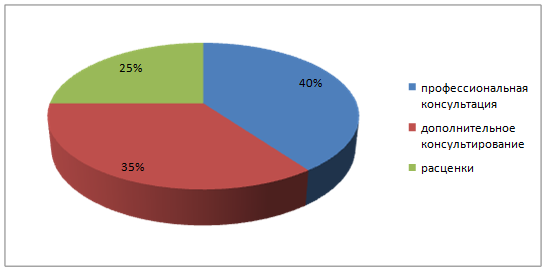 Наибольшее число факторов, влияющих на клиента при выборе (40%) является – профессиональная консультация менеджера, 20% - дополнительное стимулирование, такое как участие в розыгрышах, лотереях, скидках, 15% - собственное представление об эффективности, 15% - расценки, 10% - исходные данные, такие как фасон, цветность, марка и т.п.