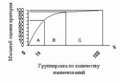 Данный метод позволяет определить оптимальное соотношение групп и видов товаров в розничном торговом предприятии с учетом основных требований для достижения поставленной цели. Метод предусматривает многоступенчатое деление всего торгового ассортимента по нескольким критериям на три категории по каждому критерию. К категории "А" относятся товары, составляющие около 70% значения критерия. К категории "В" относятся товары, составляющие около 25% значения критерия, а к категории "С" – около 5%. Причем, в первую категорию рекомендуется включать примерно 15% наименований товаров от общего количества, во вторую группу 35%, а в третью 50%.
