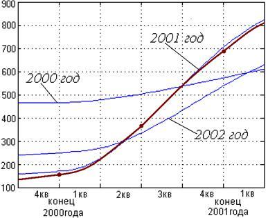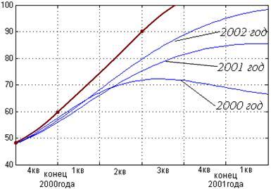 При моделировании услуги на несколько лет вперед нам нужно знать данные за первый год. В качестве промежуточного отрезка на начальном этапе рассматривался 4кв 2000 года, потом конец 2001г и конец 2002года. Результаты моделирования представлены на рисунках слайда 3. Из рисунков хорошо видно, что теоретическая и экспериментальная кривые практически совпали на среднесрочном отрезке – конец 2001 года. Это свидетельствует о том, что оценка коэффициентов была произведена, верно и данная модель для монопольной услуги ISDN работает в полной мере.