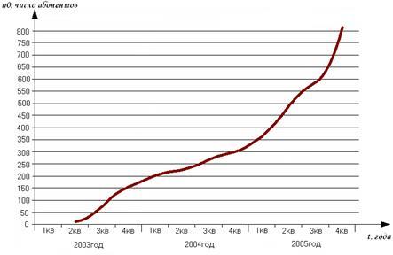 Первые подключения к портам широкополосного доступа ADSL произведены в апреле 2003 года. Этот период можно считать началом оказания услуги. Жизненный цикл услуги ADSL в настоящее время находится в стадии роста и пока о периоде насыщения говорить еще рано. Фактическое количество ADSL-абонентов показано на рисунках слайда 5.