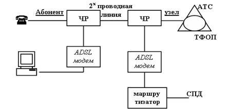 ADSL в первую очередь предназначены для скоростного доступа в Интернет, когда трафик из сети к абоненту гораздо больше, чем обратный, который содержит только запросы. Для технологий ADSL необходимо применение линейных кодов, в спектре которых отсутствуют низкочастотные спектральные составляющие. При этом телефонный сигнал, спектр которого находится в области низких частот, не создает помех сигналу передачи данных. Разделение этих сигналов у абонента и на узле сети реализуется с помощью частотных разветвителей - ЧР, называемых также сплиттерами. На данном рисунке ТФОП – это телефонная сеть общего пользования, АТС – автоматизированная телефонная станция.