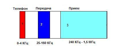 ADSL – Ассиметричная цифровая абонентская линия – интеграция аналоговой (обычной) телефонии и передачи данных на базе частотного разделения каналов. Скорость передачи данных к абоненту до 8 Мб/с. Также не требует прокладки кабеля. Работает в режиме постоянного соединения (без коммутации). Данная услуга работает как в Томске, так и по области. Диапазон используемых частот – 1,5 МГц.