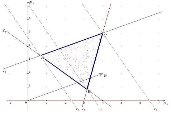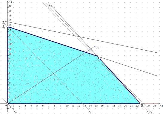 Строим вектор нормали, координаты которого . Передвигая линию уровня r в направлении нормали, находим, что Fmin