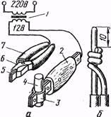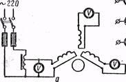 Метод индуктированных напряжений (рис. 7, а) заключается в следующем. Обмотки фаз разъединяют и к одной из обмоток подводят напряжение, равное 20—25% от номинального, а в двух других фазах вольтметром измеряют индуктированные напряжения. В обмотке с междувитковым замыканием в замкнутом контуре возникает против о э.д. с. и индуктированное напряжение уменьшается. Чтобы определить обмотки, имеющие междувитковые замыкания, поочередно на обмотки всех фаз электродвигателя подают напряжения и измеряют индуктированные напряжения.