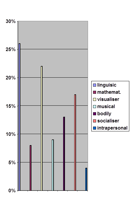 Figure 1 shows the result of the questionnaire. So, refer to the Gardner’s table of the intelligences it is possible to conclude that the most part of the learners had linguistic, visual and socialiser intelligences.