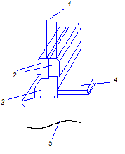 Рисунок 1. Конструкция деревянного оконного блока с двойным остеклением: 1 – остекление, 2 – оконный переплёт, 3 – оконная коробка, 4 – подоконная доска, 5 – стена