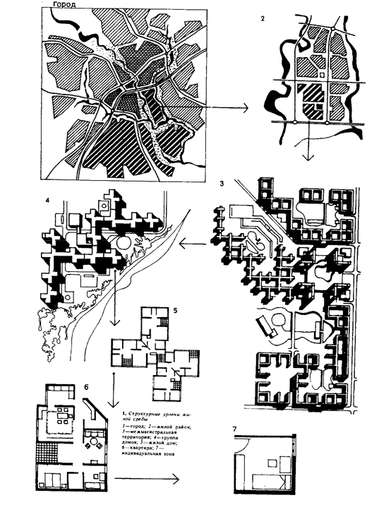 На каждом своем уровне - от квартиры до системы расселения - жилая среда обладает определенной структурой. Так, в масштабе поселения, жилого района или комплекса, она представляет собой совокупность элементов природного ландшафта, жилых зданий, объектов культурно-бытового назначения, транспортных и пешеходных путей, элементов благоустройства и озеленения и т.п. .
