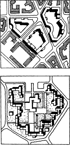 Однако "ковровая" застройка всегда сохраняет свой существенный признак - внутренний двор принадлежит одной квартире. В практике можно найти немало примеров использования сложных по конфигурации исходных блок-квартир, что освобождает рисунок плана от строгой геометричности и сообщает ему больше свободы и живописности.