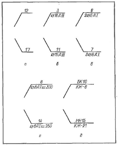 1) обозначения номеров позиции или марок изделий, элементов конструкций, санитарно-технических, технологических и других установок, чертежей узлов, марок отправочных и заготовительных элементов, наименования элементов конструкций и т. п.;