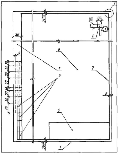 1 — внешняя рамка; 2 — основная надпись; 3 — дополнительные графы; 4 — поле для подшивки; 5 — рабочее поле; 6— номер страницы альбома типовой проектной документации; 7 — рамка рабочего поля.