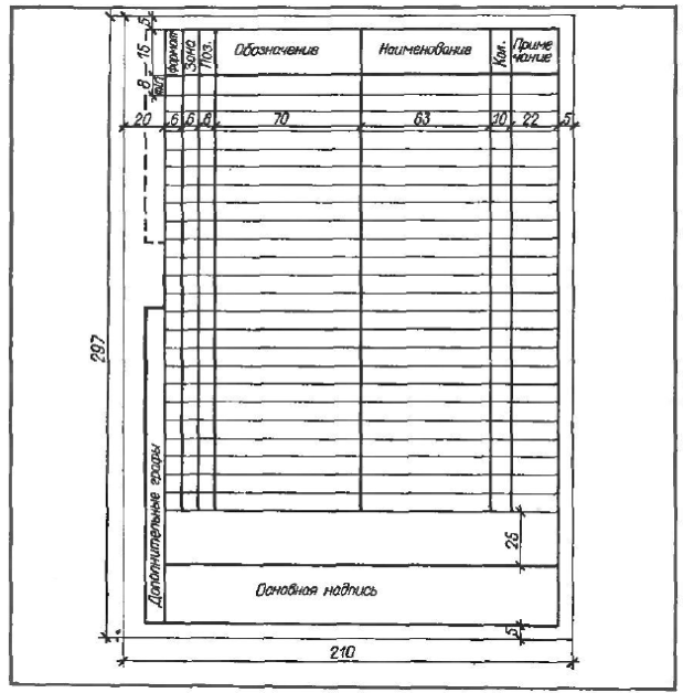 Сведения о документе: наименование, соответствующие шифры, наименование организации, выпустившей этот документ, дату выпуска, установленные подписи, сведения технического архива и т. п. указывают в основной надписи и в дополнительных графах. Само содержание документа — чертежи, текст и т.п.— размещают на рабочем поле, ограниченном рамкой рабочего поля листа.