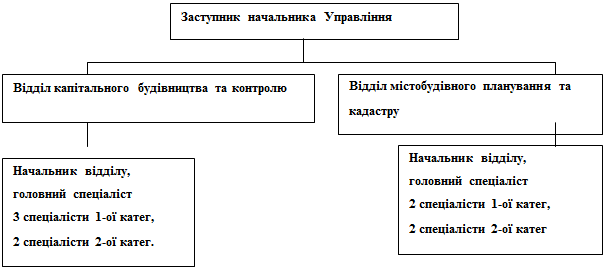 Вище вже було зазначено, що до Управління входять: Відділ капітального будівництва та контролю та Відділ містобудівного планування та кадастру.