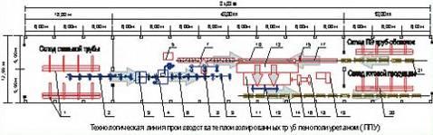 Трубу, находящуюся на траковом устройстве (7) оснащают центраторами, на которых закрепляют сигнальные провода системы оперативного дистанционного контроля (ОДК). Затем, стальную трубу при помощи тракового устройства (7) перемещают на стол сборки труб и оболочек (10), где уже должна находиться полиэтиленовая или оцинкованная спирально-замковая стальная труба-оболочка, вставляя и перемещая стальную очищенную трубу внутрь трубы-оболочки. Полиэтиленовая или стальная труба-оболочка попадает на стол (10) участка сборки труб и оболочек следующим образом: из склада труба-оболочка перекладывается на транспортер (конвейер) для оболочек (21). С помощью этого транспортера (21) труба перемещается к столу установки подгона длины оболочек (17) и затем трубу-оболочку размещают на этом столе. С помощью отрезного устройства (15) установки подгонки длины оболочек, приводят длину трубы-оболочки в точное соответствие с длиной стальной очищенной трубы, поступившей на траковое устройство (7) и затем перемещают трубу-оболочку на стол (10) и закрепляют трубу-оболочку на нем. После размещения стальной трубы с центраторами и проводами системы ОДК внутри оболочки, образовавшуюся конструкцию «сборку» перемещают со стола участка сборки труб и оболочек (10) в камеру термостабилизации «сборок» (12). Затем «сборки» из камеры термостабилизации (12) перемещают на заливочный стол (11). На заливочном столе (11) «сборки» оснащают технологическими заглушками, а затем с помощью дозирующе-смесительной установки (16) необходимое количество смешанных жидких компонентов пенополиуретана заливают в межтрубное пространство между стальной трубой и оболочкой. После технологической выдержки необходимой для вспенивания и полимеризации компонентов ППУ, технологические заглушки снимают, а готовые теплоизолированные трубы перекладчиком теплоизолированной трубы (13) перемещают с заливочного стола (11) на транспортер теплоизолированной трубы (14) для перемещения готовых труб из цеха и размещения их на складе готовой продукции (20).