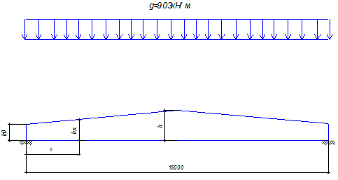 Исходные данные: балка двускатная многослойная клееная; расчетный пролет l =15 м; поскольку кровля рулонная принимаем уклон i =0,1.