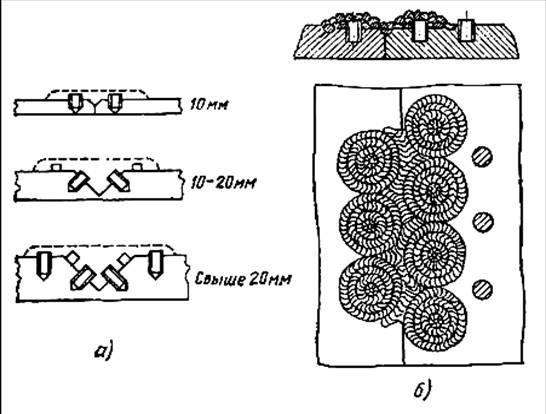 Рис. 1.3.1. Сварка чугуна с применением стальных шпилек: а - установка шпилек при V-образной подготовке кромок; б - обварка шпилек;