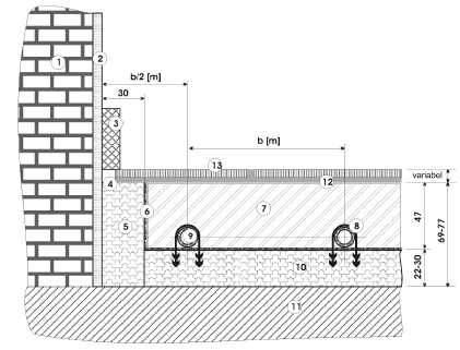 В случае применения половых покрытий из керамики или мраморных плит рекомендуется разложить на трубах сетку с толщиной проволоки 3 мм или больше и размером ячейки 100x100 мм. с целью армирования бетона. Армирование должно быть прервано в районе разделительных швов. Разделительные швы необходимо применять, если длина бетонной плиты превышает 8 м, минимальная ширина шва должна составлять 5 мм. Перед бетонированием труб необходимо провести испытания продолжительностью 24 часа при давлении 6 бар. Во время бетонирования трубы должны быть под давлением около 3 бар температура воды около 20С. Эта температура должна оставаться на все дни затвердевания бетона (21-28 дней)