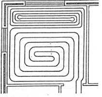 При зигзагообразной укладке горячий теплоноситель поступает в змеевик, как правило, у внешней стены помещения и непрерывно охлаждается при протекании по трубам. Поэтому в месте поступления теплоносителя (начале змеевика) достигается большая температура поверхности и, как следствие, большая теплоотдача. Далее, вглубь помещения, вследствие охлаждения теплоносителя уменьшаются температура поверхности пола и плотность теплового потока. Для достижения достаточной температурной равномерности требуется повысить скорость теплоносителя в змеевике, следовательно, необходимо применение циркуляционного насоса с большей производительностью, чем при аналогичном нагревателе со спиралевидными змеевиками.