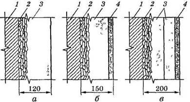 Рис. 3.1. Товщина і послідовність нанесення шарів звичайної штукатурки залежно від її призначення: а — проста; б — поліпшена; в — високоякісна; 1 — основа; 2 —набризк; 3 — грунт; 4 — накривка
