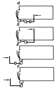 . Воздушная завеса — это результат взаимодействия двух потоков: воздушной струи и набегающего на нее горизонтального потока воздуха. Воздушная струя, не препятствуя движению людей и транспорта, как правило, существенно уменьшает количество проникающего в помещение наружного воздуха. При этом воздушная завеса может, быть устроена по месту воздухозабора и температуры подаваемого воздуха (рис.2): а —