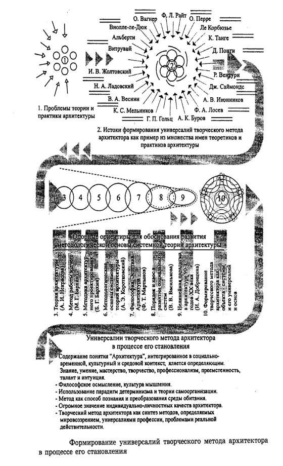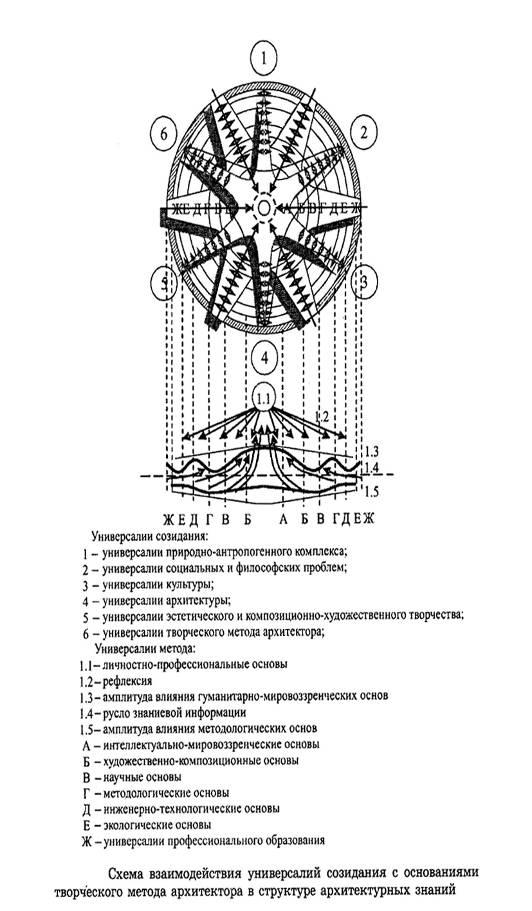 Образовательный процесс должен осуществляться не просто через сумму отдельно взятых методов, способов, подходов, не через отдельно взятые аспекты философии и науки, композиционно-художественные средства и приемы, а непосредственно через творческий метод архитектора как целостную совокупность универсалий, значений и смыслов.