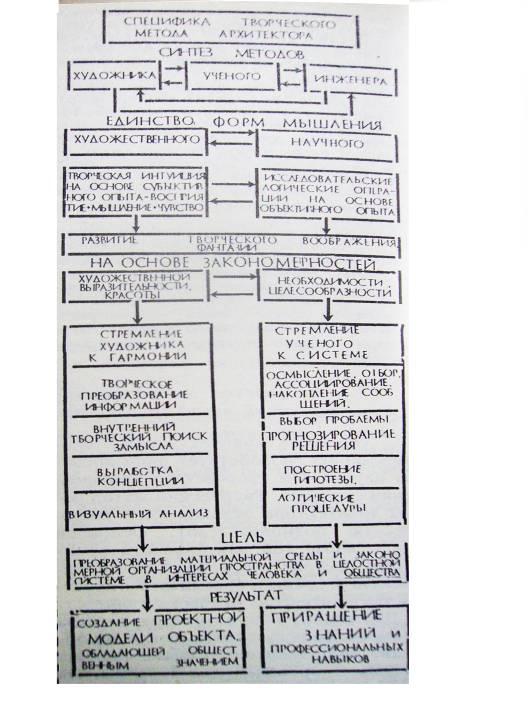 Творческий метод архитектора представляет собой своеобразный синтез творческих методов художника, ученого и инженера. Научный и художественный методы не выводятся один из другого. В процессе архитектурного творчества происходит их взаимопроникновение и взаимоотражение. В проектировании снимаются противоречия между категориями исследования и воображения. Научное понятие и художественный образ, которое в суждениях о науке и искусстве рассматриваются как противоположности, здесь объединяются. В архитектурном творчестве «художественное» и «техническое» выступают подвижными, взаимодополняющими друг друга сторонам творческого процесса. В творчестве архитектора соединяется стремление ученого к системе и художника к гармонии. Принципиальная разница между научной и художественной деятельностью – это отсутствие элементов субъективного и эмоционального в результатах труда ученого и повышенное содержание того и другого в продуктах художественного творчества. В науке единичное выступает в форме общего, а в архитектуре как искусстве общее выступает в форме единичного.