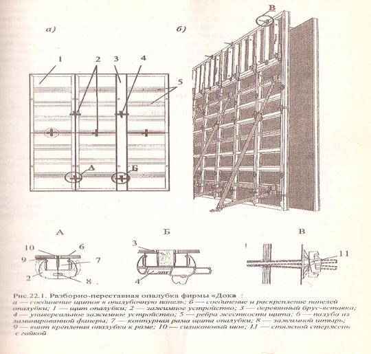 , масса одного элемента такой опалубки не должна превышать 50 кг, что позволяет при необходимости устанавливать и разбирать опалубку вручную. При этом выдерживается боковое давление бетонной смеси на опалубку до 60 кнм2
