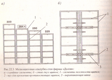 Мелкощитовая опалубка фирмы «Далли». Опалубка фирмы «Далли» состоит из модульных элементов, что позволяет комплектовать опалубочную панель при вертикальном и горизонтальном расположении щитов. Основное достоинство опалубки в том, что из минимального количества элементов и оригинального крепежа можно собирать вручную опалубку самых различных горизонтальных и вертикальных конструкций. Щиты выпускают трех размеров по высоте 264; 132 и 88 см и 10 размеров по ширине от 75 до 20 см с градацией через 5 см, стандартные щиты размером 264х75 см весят 60 кг, допускается ручной монтаж элементов опалубки. На торцах каждого щита предусмотрены две приваренные шестигранные гайки для прочного штыревого соединения двух примыкающих щитов.