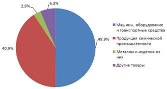 В товарной структуре импорта из стран дальнего зарубежья наибольший удельный вес заняли машины, оборудование и транспортные средства – 49,9%; продукция химической промышленности – 40,9%; металлы и изделия из них – 2,9%.