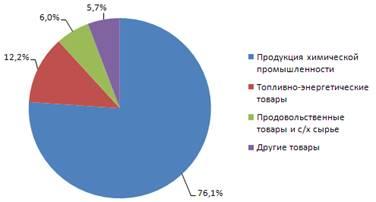 76,1% от объема импорта из стран СНГ (112,7 млн долларов) составила продукция химической промышленности, 12,2% - топливно-энергетические товары (18,1 млн долларов), 6% - продовольственные товары и с/х сырье (8,9 млн долларов).