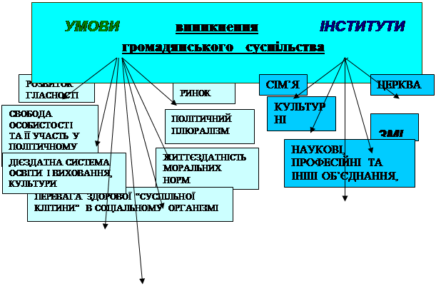 Інститутами громадянського суспільства є об`єднання громадян (в т. ч. громадські організації, політичні партії, профспілки, церква, сім'я, різні заклади освіти, приватна власність, засоби масової інформації), які: