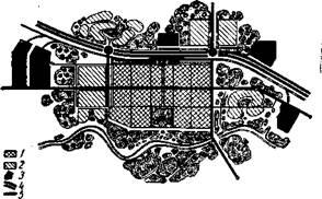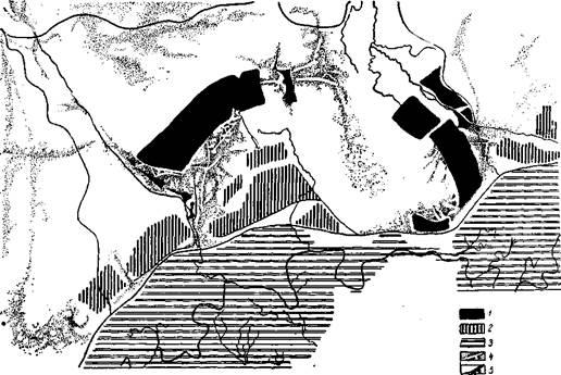 Принципиальная схема планировки нового города с учетом особенностей рельефа: 1 – город; 2 – промышленность; 3 – территория, заливаемая весенними паводками; 4 – озеленение; 5 – пруд