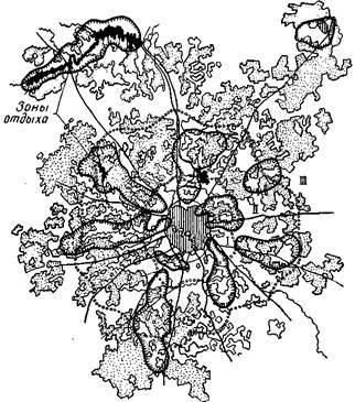 Территориальное зонирование городов СССР имеет в виду прежде всего удовлетворение потребностей населения в здоровых условиях жизни. Взаимное размещение отдельных зон исходит из условий создания наибольших удобств транспортного сообщения одних зон города с другими.