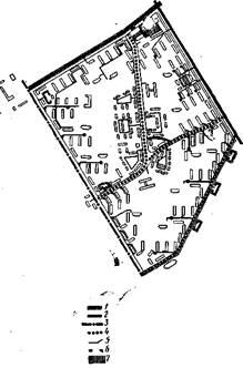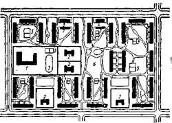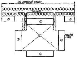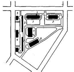 1 – гараж на 400 мест; 2 – почта, банк, сберкасса; 3 – универмаг; 4 – магазин продовольственный на 30 рабочих мест; 5 – комбинат бытового обслуживания на 80 рабочих мест; 6 – прачечная на 2000 кг белья в смену; 7 – ресторан-столовая
