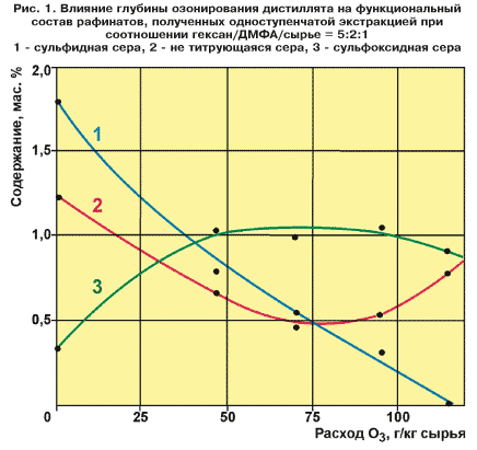 Содержание не титрующейся серы в рафинатах и экстрактах снижалось, пока расход О3 не достигал ≈ 70 г/кг (1,5 моль/моль), затем начинало нарастать, что вполне объяснимо. В начале процесса тиофеновые компоненты дистиллята, связывая озон, превращаются в кислородсодержащие производные, хорошо растворимые в ДМФА и переходящие в состав экстрактов, поэтому количество этих сернистых соединений в рафинатах уменьшается. На поздних стадиях идет окисление части сульфоксидов в тоже не титрующиеся сульфоны .