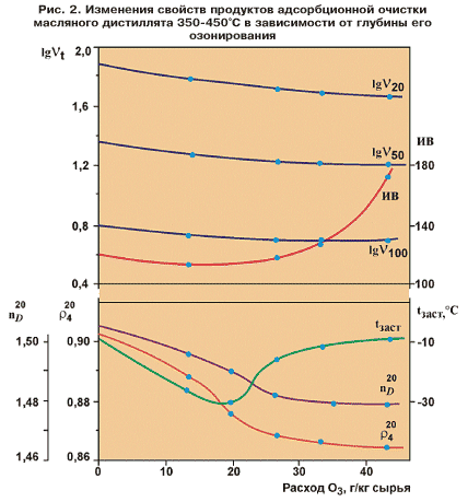 В результате получены масла с очень высокими индексами вязкости (ИВ), вплоть до 175 ед. (против 70 для исходного дистиллята, см. рис. 2). Важно, что при сравнительно умеренной глубине озонирования порядка 20 г О3/кг значительно — более чем на 20°С — снижается температура застывания (tзаст) масла. Выходы столь глубоко очищенных масел, конечно, недостаточно высоки (около 60 мас.% на сырье). Однако еще 20-22 мас.% составляют фракции, извлекаемые из слоя адсорбента бензолом; значительную часть их можно тоже оставлять в составе очищенного продукта, если не задаваться целью получения сверхвысокоиндексных масел. Еще 6-8% массы сырья представляют собой щелочные экстракты — концентраты органических кислот, могущие найти себе самостоятельное полезное применение.