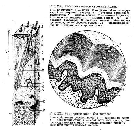 Кожа развивается из двух эмбриональных зачатков. Из эктодермы зародыша развивается наружный слой кожи — эпидермис (рис. 235). Глубокие слои кожного покрова — дерма и подкожная клетчатка — формируются мезенхимой, продуктом дифференцировки дерматомов зародыша. Эпидермис кожи
