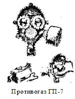 Принцип защитного действия основан на предварительной фильтрации вдыхаемого воздуха от вредных примесей. Перед применением противогаз необходимо проверить на исправность и герметичность. Гражданский противогаз ГП-7 одна из последних и самых совершенных моделей. Он надежно защищает от 0В и многих СДЯВ, радиоактивной пыли и бактериальных средств. Подбор лицевой части необходимого типоразмера ГП-7 осуществляется на основании измерения мягкой сантиметровой лентой горизонтального и вертикального обхвата головы. Затем по специальным таблицам подбирается лицевая маска противогаза
