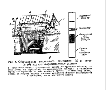 При оборудовании под ПРУ погреба (рис. 4, б) предварительно усиливают его перекрытие, затем на перекрытие насыпают слой грунта в 60-70 см. Крышку люка (лаза) плотно подгоняют. Делают вытяжной вентиляционный короб.
