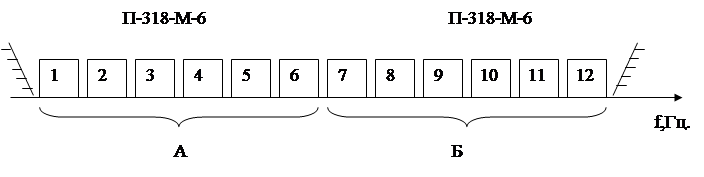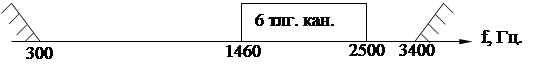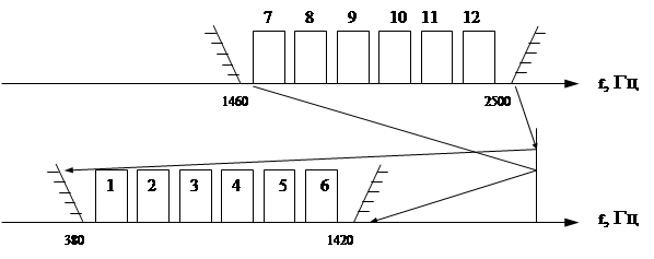 стандартной (исходной) 6-ти канальной группы, занимающей спектр 1460-2500 Гц. Основная стандартная 6-ти канальная группа составлена из спектров частот 7-12 каналов, каждый из которых образуется путем модуляции несущих колебаний с частотой 1530, 1710,1890,