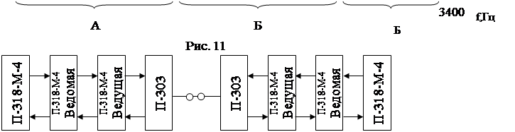 Структурная схема включения "ведущей" и "ведомой" у паковок, аппаратуры П-318 в канал связи образованный аппаратурой П-309. показана на рис.12