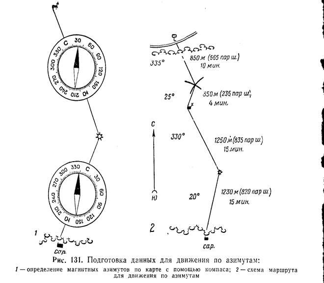 дой поворотной точке маршрута, начиная с исходной, находят на местности по компасу нужное направление пути и двигаются по нему, ведя счет пройденного расстояния.