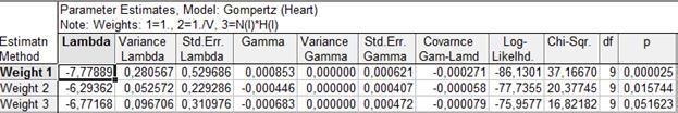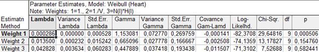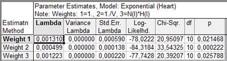 Сравнив оценки параметров для остальных семейств распределений, предлагаемых системой «Statistica», можно сделать вывод, что только для распределения Вейбулла (при оценивании по минимуму суммы взвешенных квадратов, т.е. по третьему алгоритму Weight 3) отсутствует значимое отличие от наблюдаемых значений: c²-критерий не даёт значимого отклонения (p=0,58). Следовательно, распределение Вейбулла с таким набором параметров описывает наблюдаемые времена жизни наилучшим образом. Однако стоит заметить, что исследователь ограничен в выборе лишь из трех представленных наборов параметров.