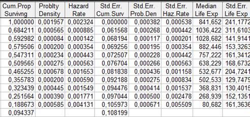 Обратимся к тому же файлу исходных данных, который использовался для построения таблиц времен жизни. Оценки Каплана-Майера функции выживания, построенные по этим данным, показаны в следующей таблице: