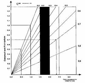 По оси ординат указанного графика отложено отношение произведения величины кредитной суммы и длительности одного оборота оборотных средств к доходу за один оборот, а по оси абсцисс — искомый срок окупаемости кредита. Кроме того, начала координат выходит семейство прямых лучей, отражавших платежи за банковский кредит и налоги в долях от дохода.