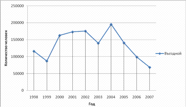 Рисунок 1 – Показатели въезда иностранных туристов в Приморский край в 1998 – 2007 гг.