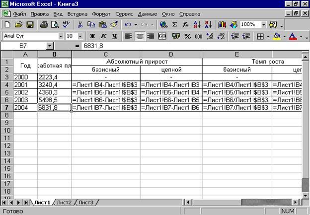 Проведем анализ рассчитанных значений, на примере 2004 года, в котором начисленная заработная плата составила 6831,8 руб. Повышение заработной платы в 2004 году по сравнению с предыдущем (2003 годом) и базисным (2000 годом) составило 1333,3 руб. и 4608,4 руб. соответственно. Заработная плата в 2004 году составила 124,2% и 307,3% от 2003 года и 2000 года, т.е. она выросла на 24,2% и 207,3% соответственно.