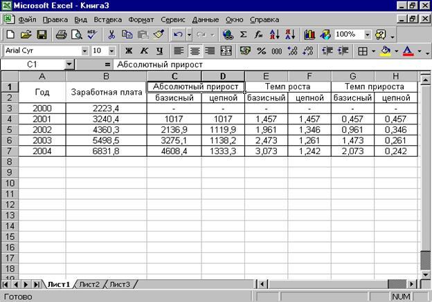 Расчет абсолютных приростов, темпов роста и прироста выполняем с помощью программы MS Excel.
