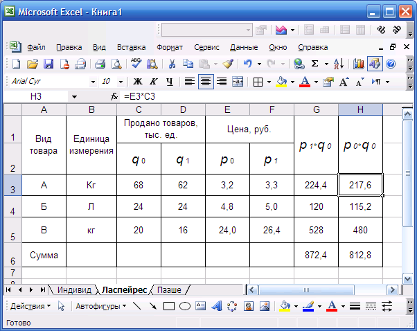 2) Общие индексы цен будем вычислять по двум формулам: а) по формуле Ласпейреса:  Расчёты выполнены с применением табличного процессора Excel в среде Windows. Расположение на рабочем листе Excel исходных данных и результатов расчёта (в формате Excel) представлены в таблице 2.3. Таблица 2.3 Расчёт агрегатного индекса Ласпейреса  Тогда Ip=872,4 / 812,8 = 1,073, или 107,3%. Индекс показывает, что если бы население приобрело товаров в месяце мае столько же, сколько и в апреле, то цены в среднем увеличились бы на 7,3%.