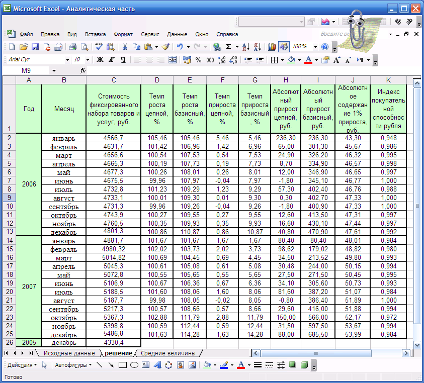 2) абсолютное содержание 1% прироста по месяцам; 3) помесячные индексы покупательной способности рубля; 4) средние по годам абсолютный прирост, темпы роста и прироста стоимости «потребительской корзины».