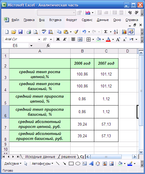 4) Средний темп роста, вычисленный как цепным, так и базисным методом получился один и тот же. В 2006 году он составил 100,86%. Следовательно, стоимость фиксированного набора потребительских товаров и услуг в этом году увеличивалась в среднем на 0,86% в месяц. В 2007 году средний темп роста составил 101,18%, т.е. стоимость «потребительской корзины» за этот год в среднем дорожала на 1,18% в месяц. Показатель 2007 г. вновь превышает значение показателя 2006 года. Поэтому опять можно сделать вывод о том, что за последний год товары подорожали значительнее. В абсолютном выражении стоимость фиксированного набора потребительских товаров и услуг в Кировской области увеличивалась в среднем на 39,24 рубля в месяц в 2006 году и на 57,13 руб. в 2007 году.